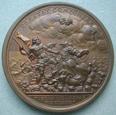 Croker, John : Der englische König Georg II wird in einer Muschelschale von 4 Pferden im Wasser gezogen ( Die Medaille wurde anlässlich des zweiten Friedensvertrages von Wien -im Jahre 1731- geprägt )
